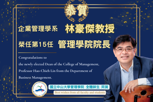 國立中山大學管理學院院長遴選結果出爐 恭賀!企管系林豪傑教授榮任管院第十五任院長 ~任期自114年2月1日起至117年1月31日~
